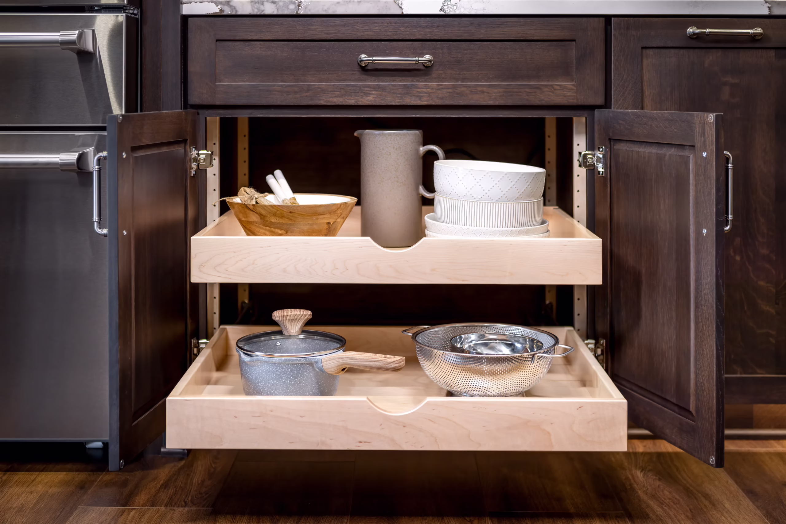 Traditional base cabinets often hide cookware behind doors where items stack awkwardly. Deep drawers are one of the most popular upgrades because they make heavy cookware easy to access.