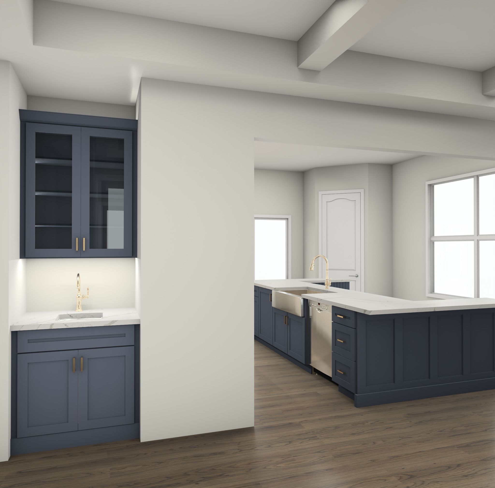 A small coffee bar tucked neatly into a corner adds a thoughtful touch of everyday luxury. With glass doors, accent lighting, and just the right amount of countertop space, it turns a daily routine into a moment of enjoyment.