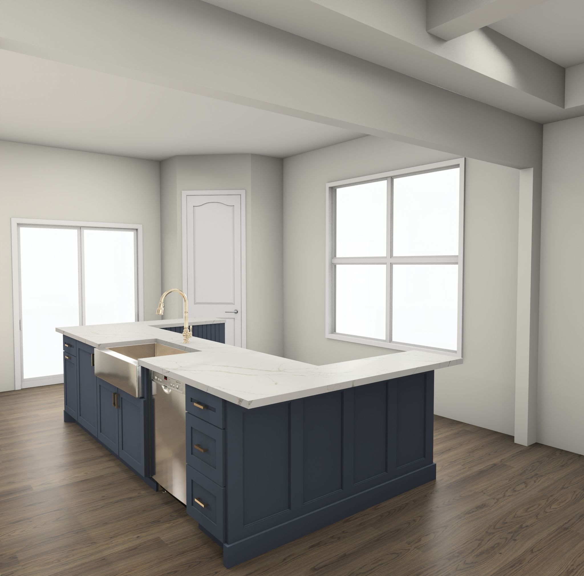 To balance the brightness, a custom blue banquette anchors the dining nook — adding both visual interest and a cozy gathering spot for morning coffee or family meals. The rich blue tone introduces a sense of calm sophistication, pairing beautifully with the light cabinetry throughout the space.